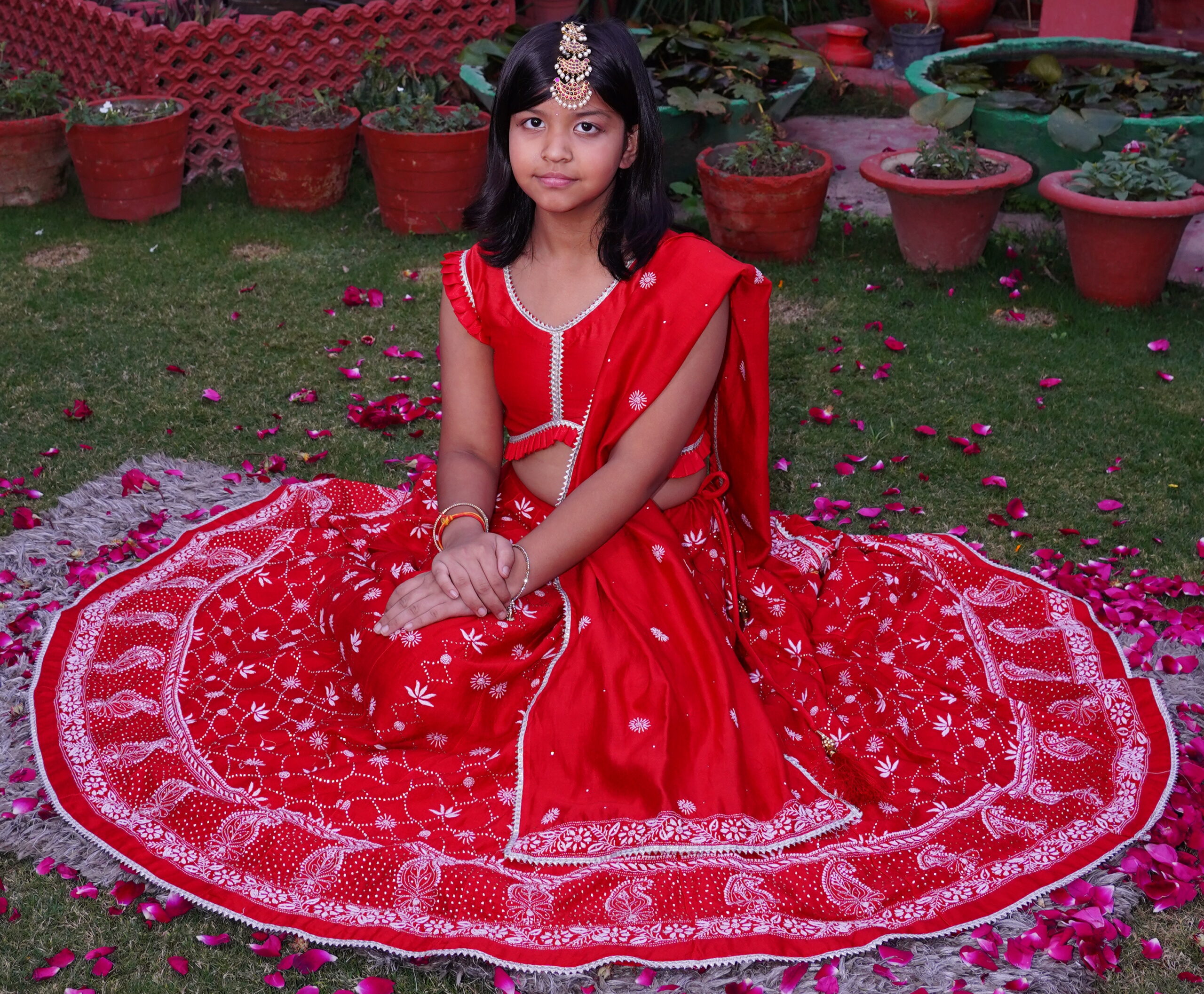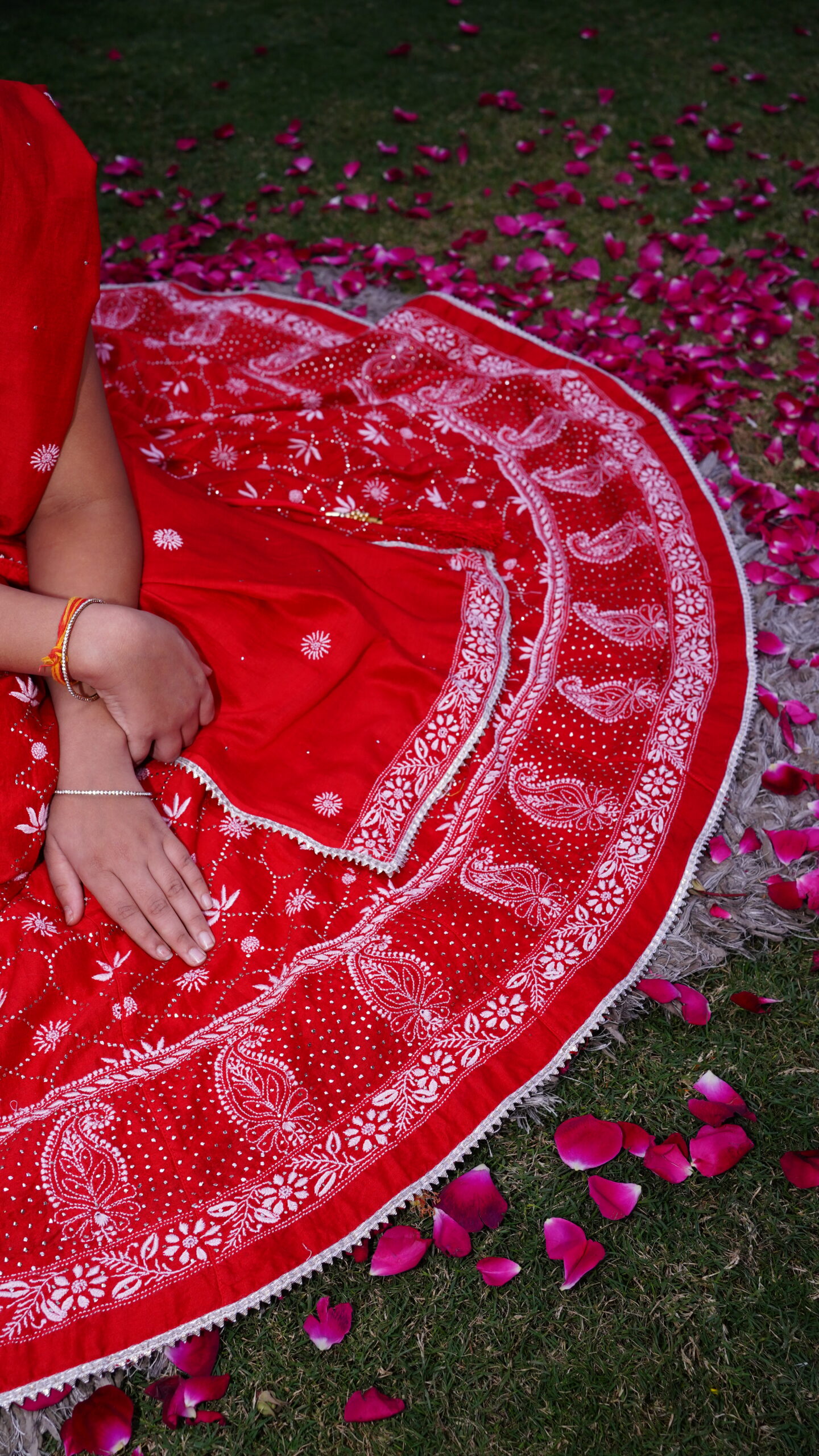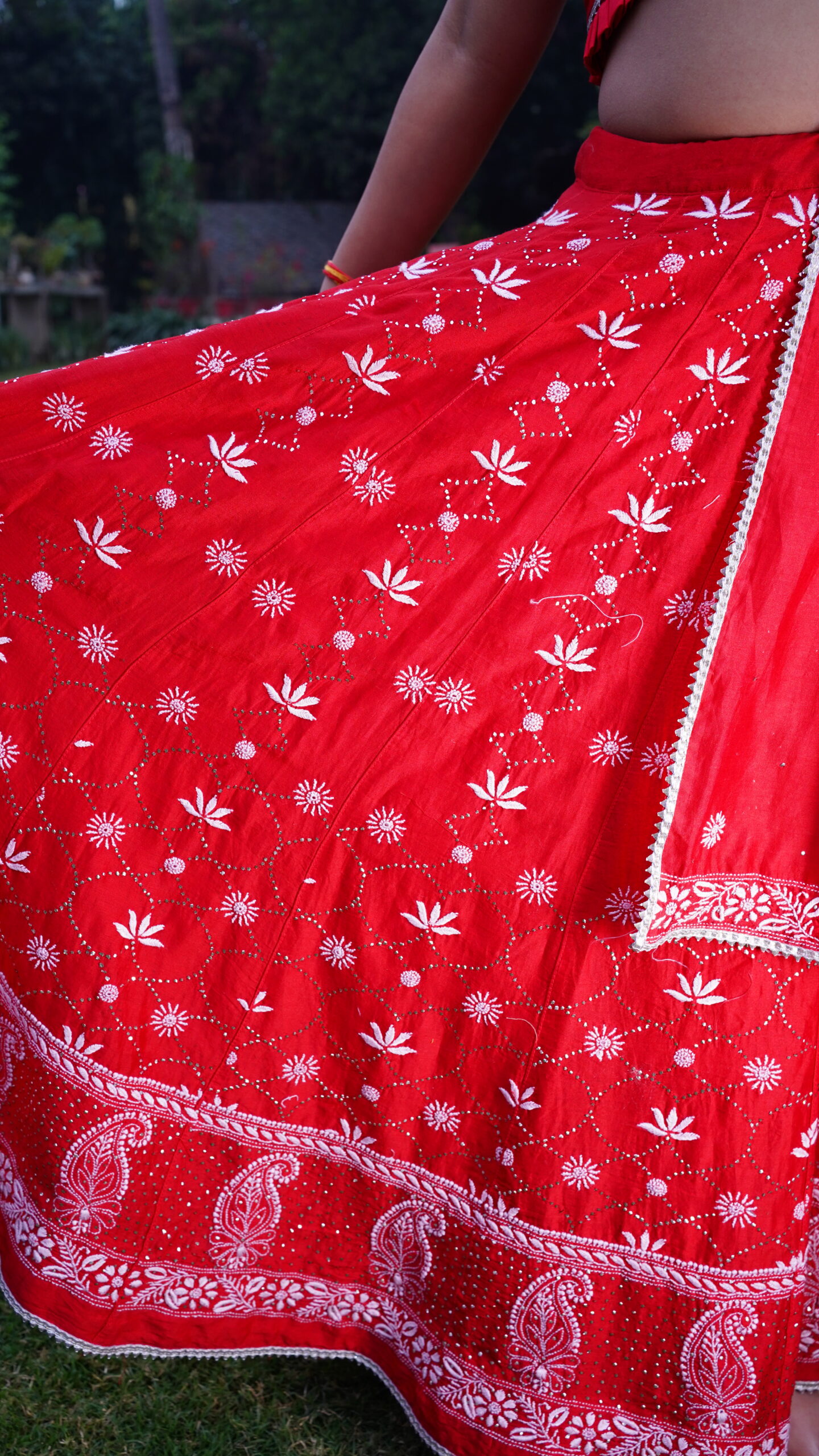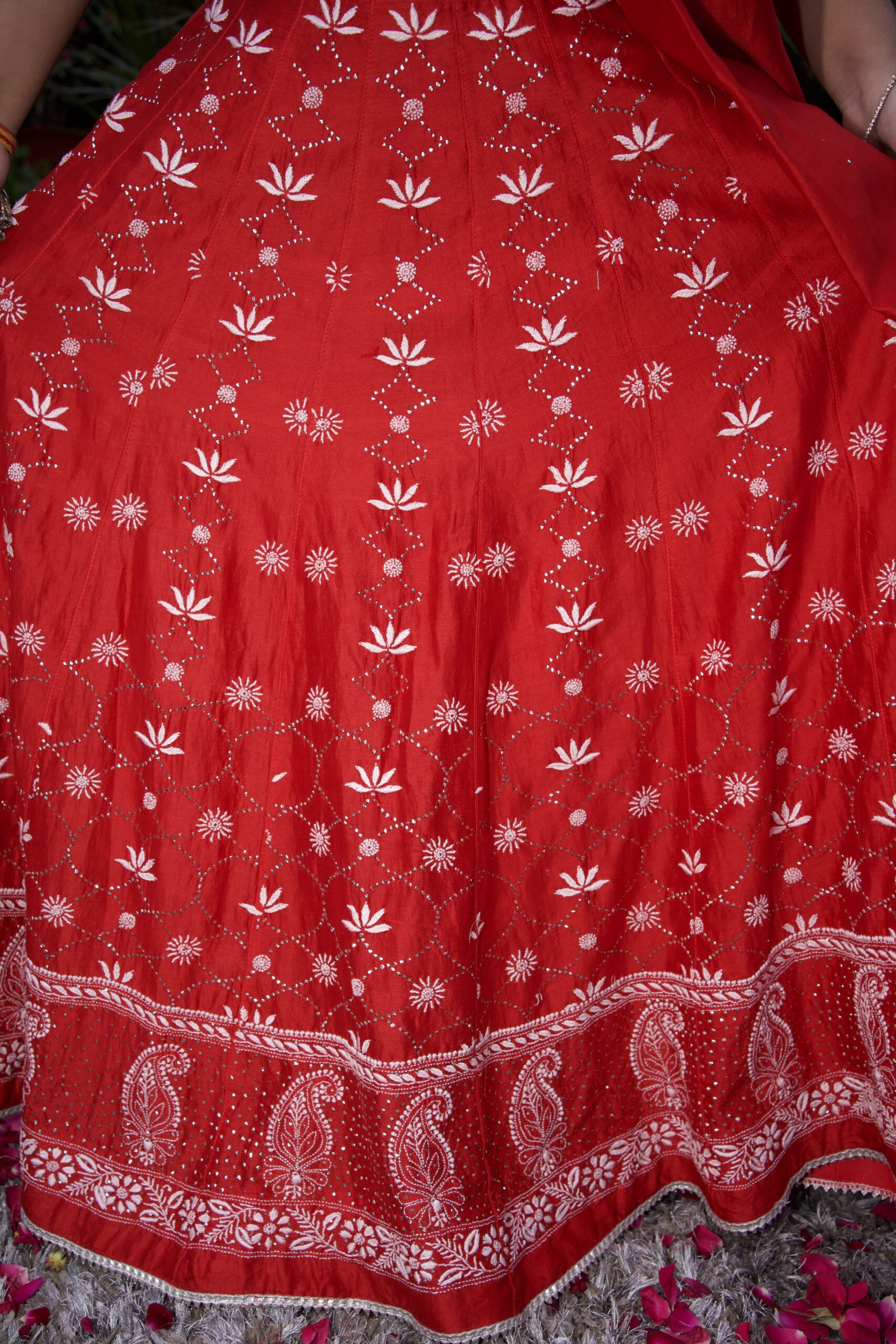 A stunning bright red chanderi lehenga hand-embroidered with delicate chikankari lotuses and adorned with beautiful mukaish work. This statement piece celebrates timeless craftsmanship – radiant, intricate and made to turn every twirl into poetry.