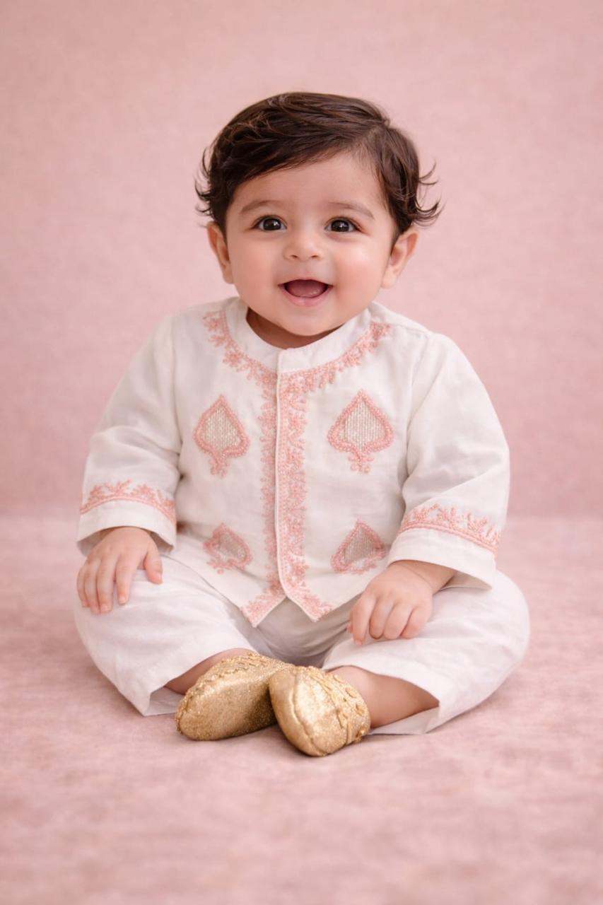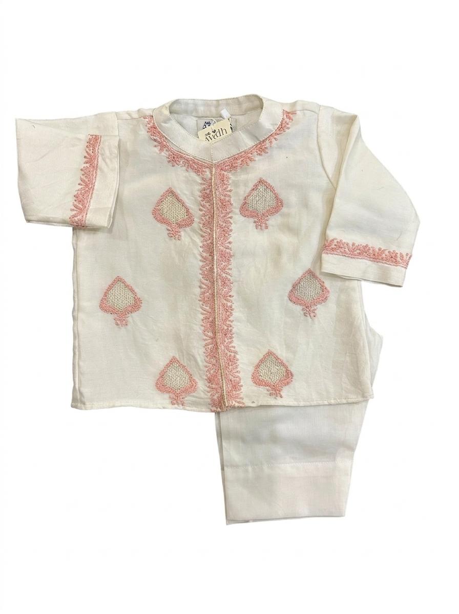 Handspun chanderi meets timeless chikankari in this thoughtfully designed kurta set for little ones. Made with an easy front open style, the kurta features delicate, intricate bootas highlighted with subtle golden kasab jaalo work adding the right hint of glimmer. Breathabke and lined with soft cotton this outfit is practical as its beautiful.