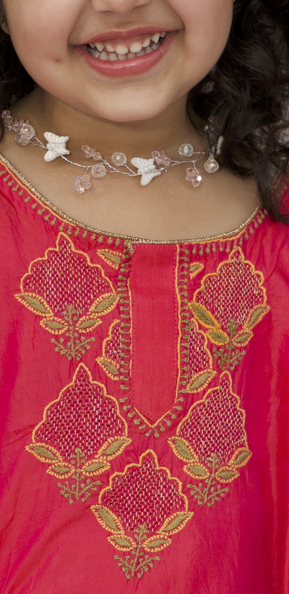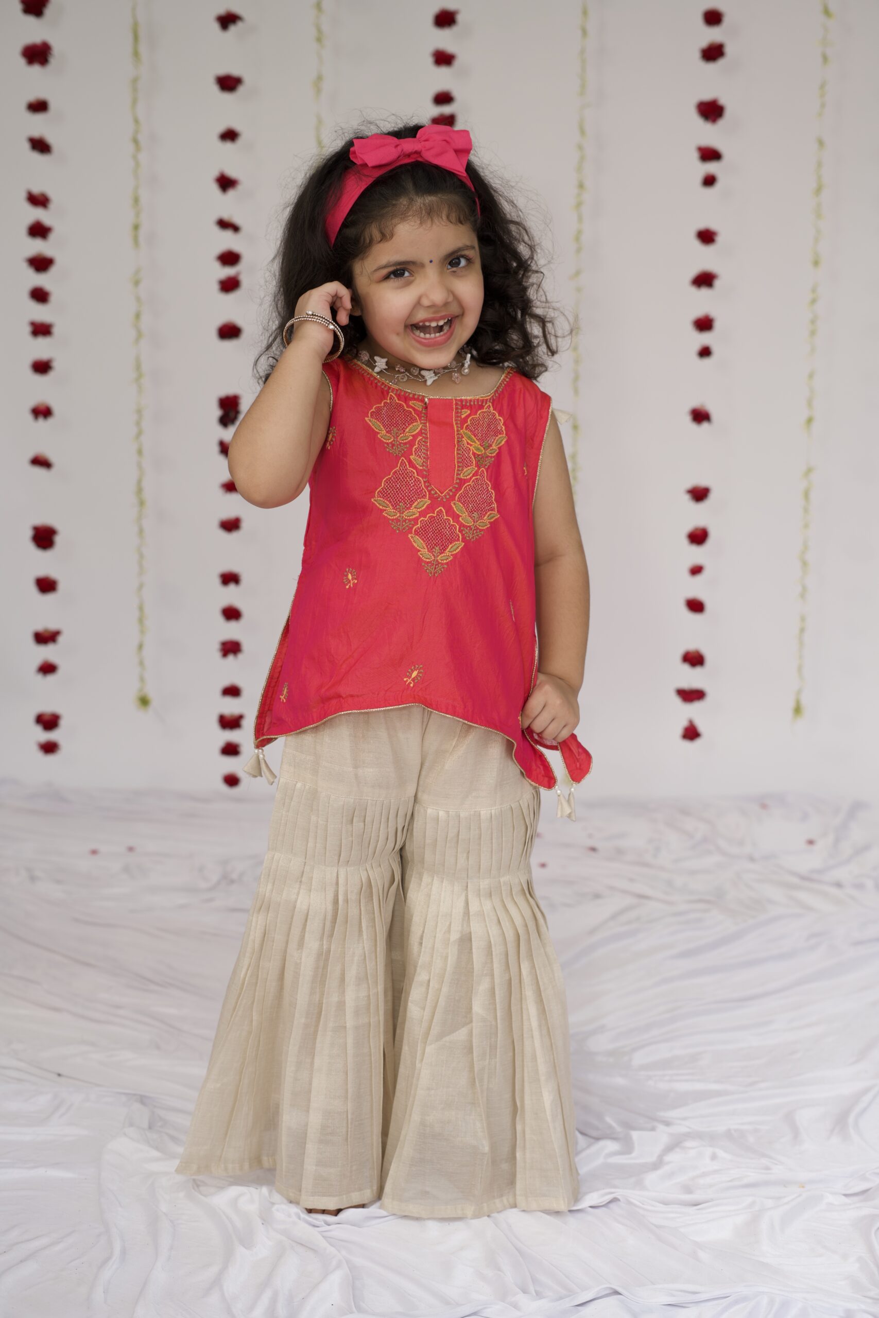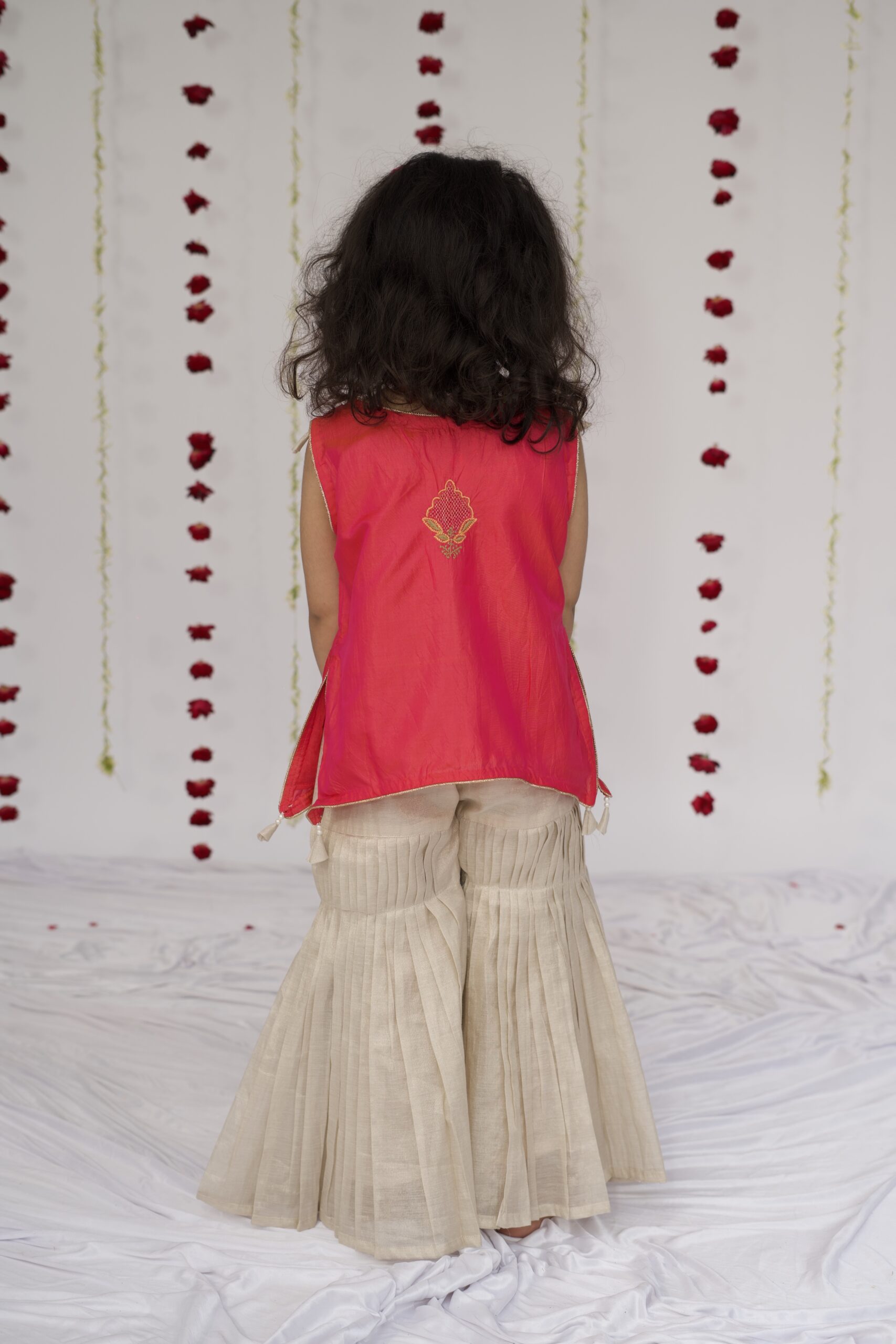 A sharming pink short silk kurta delicate chikankari motifs completed with golden kasab thread jaali. Paired with a golden sharara, this set blends playful charm for festivities.