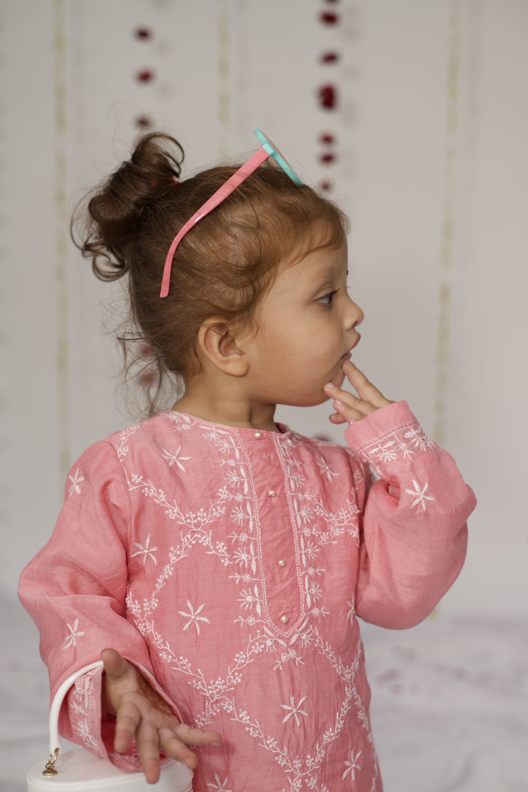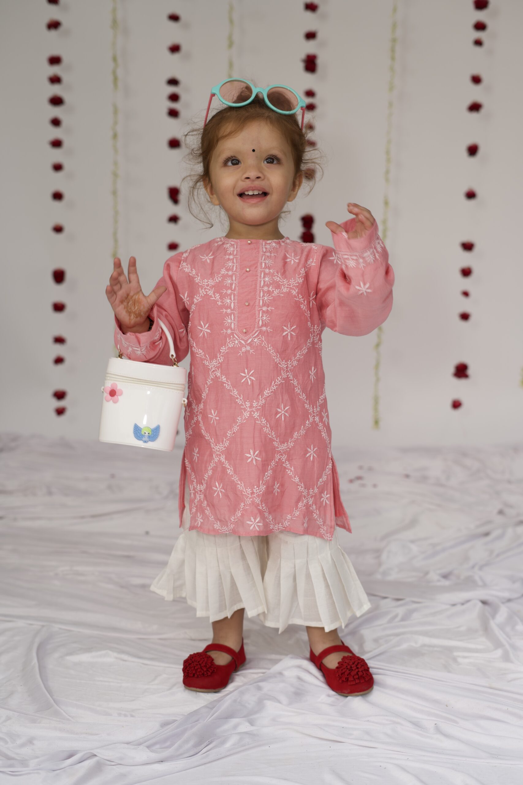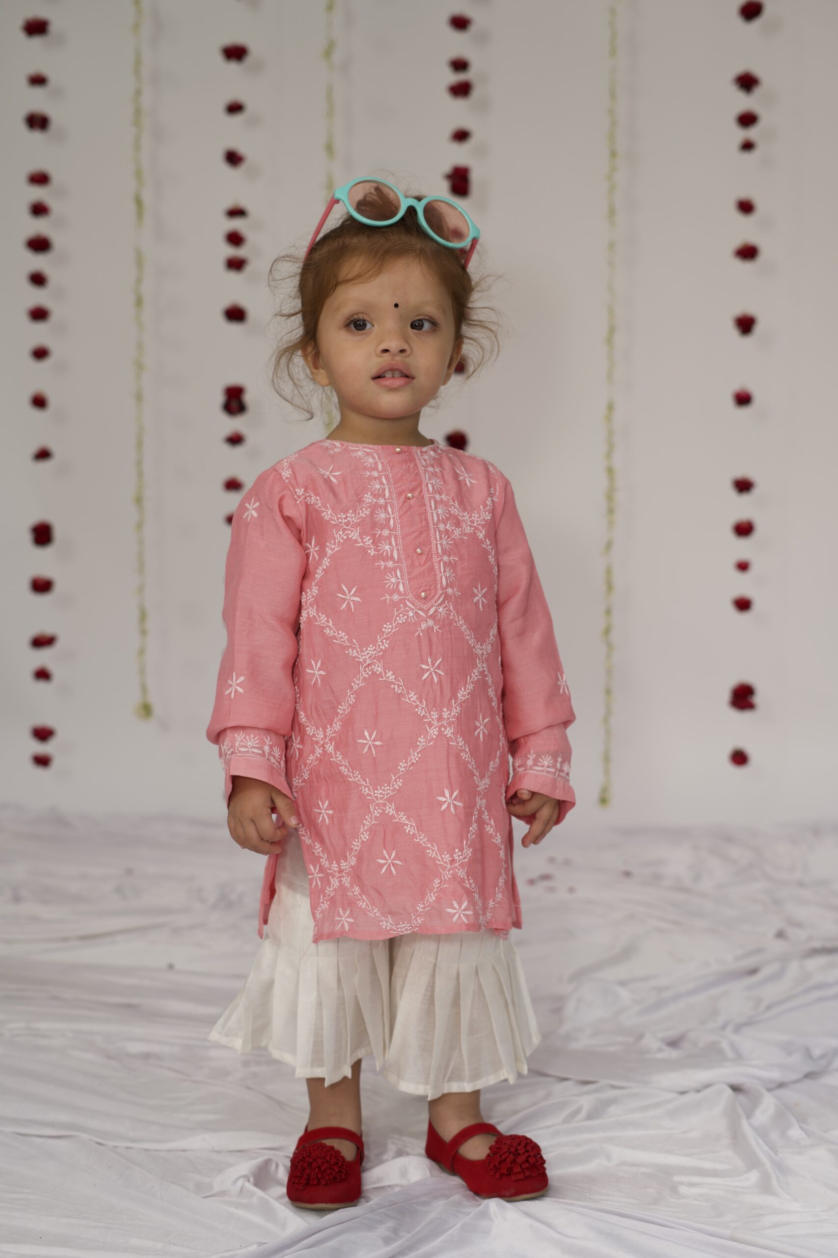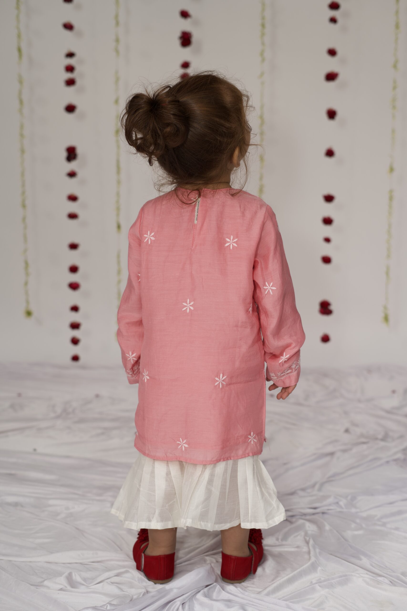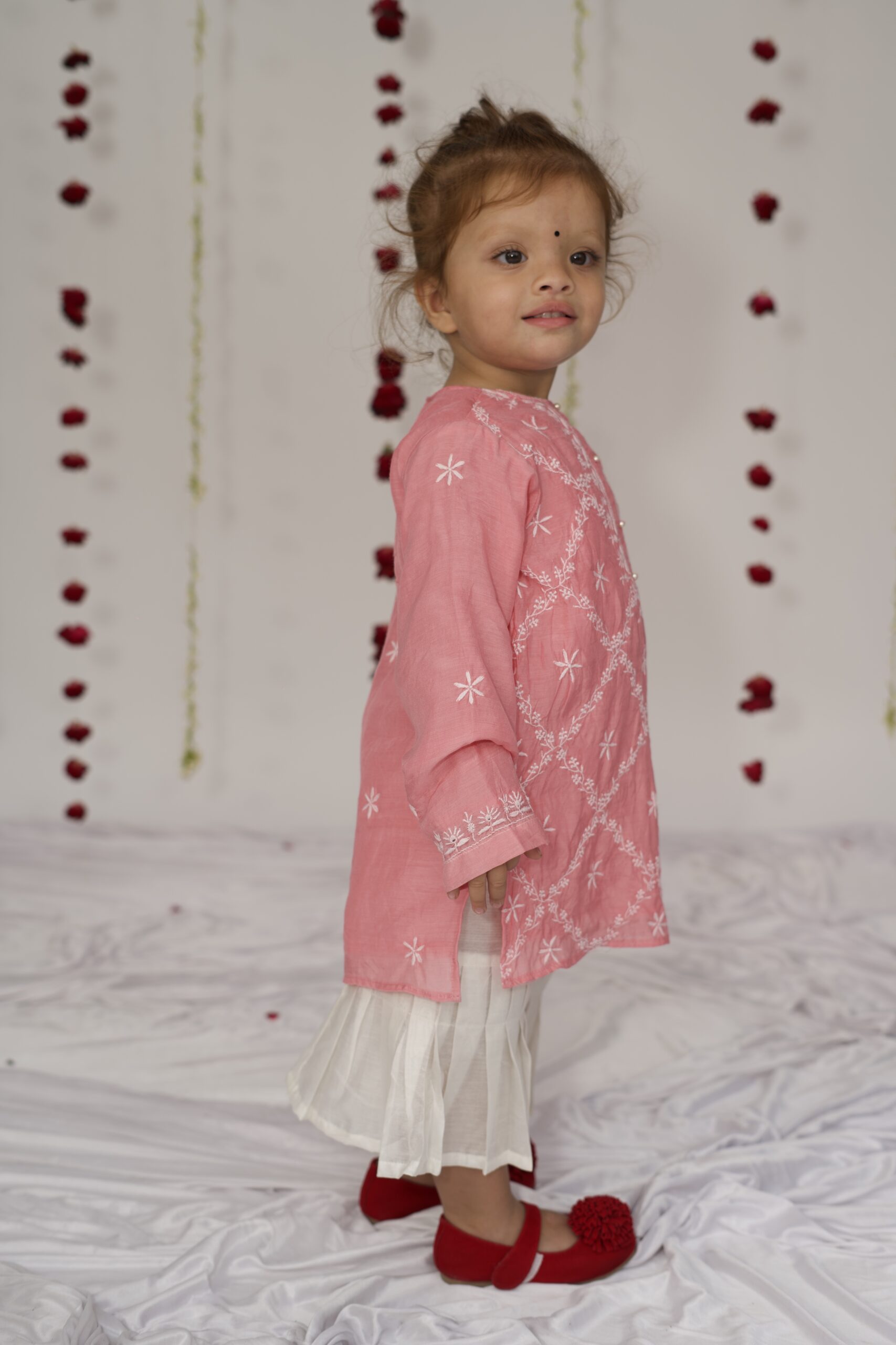 A delicate rose pink pure muslin kurta set, adorned with exquisite hand-done Lucknowi chikankari. The intricate embroidery and soft, airy fabric make it perfect for little ones – graceful yet effortless. Paired with a pleated sharara that moves effortlessly and beautifully, this set brings together the charm of tradition and the ease of childhood.