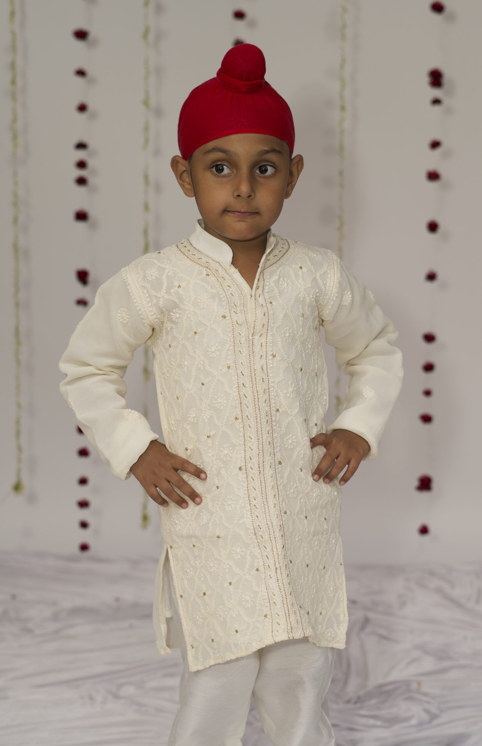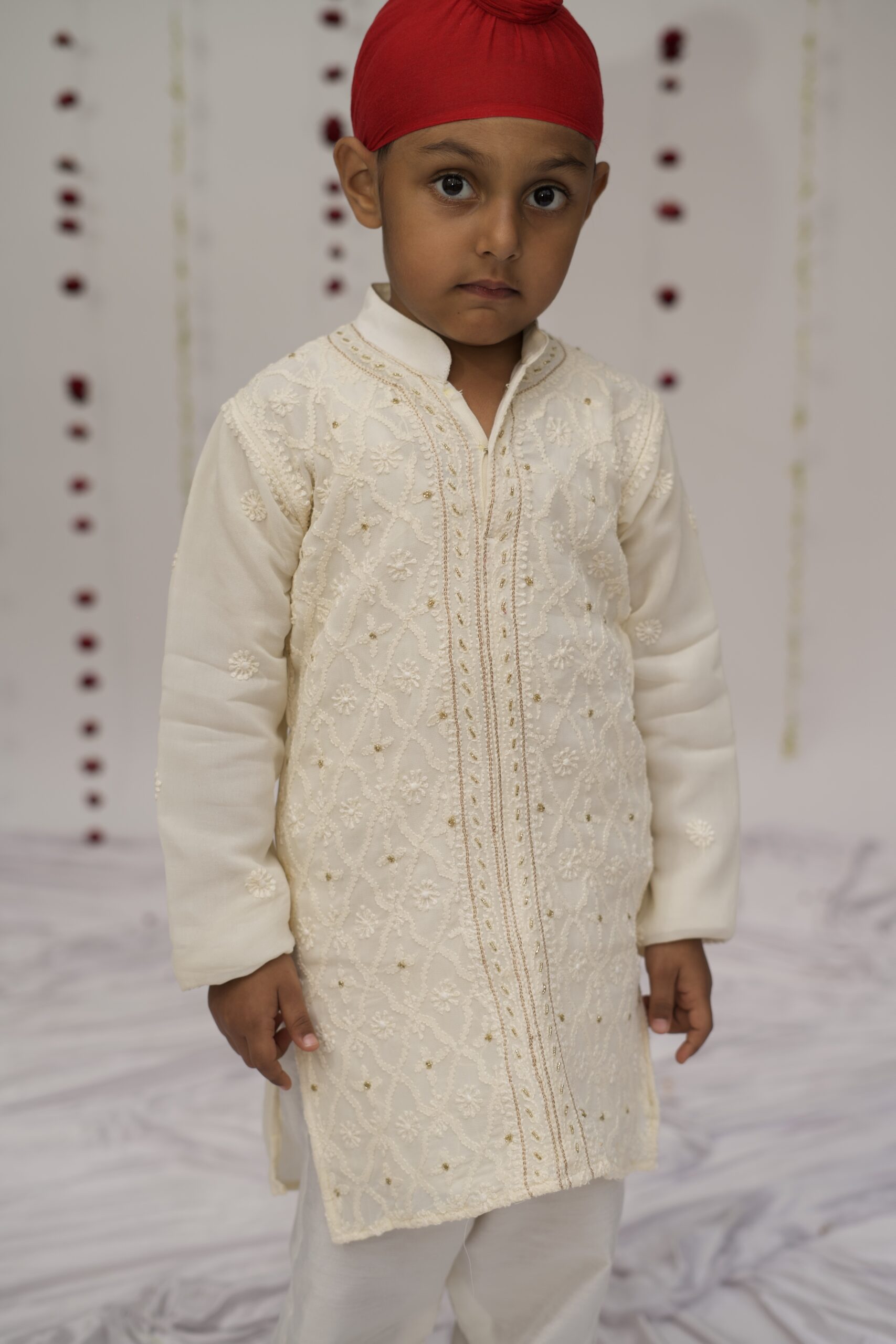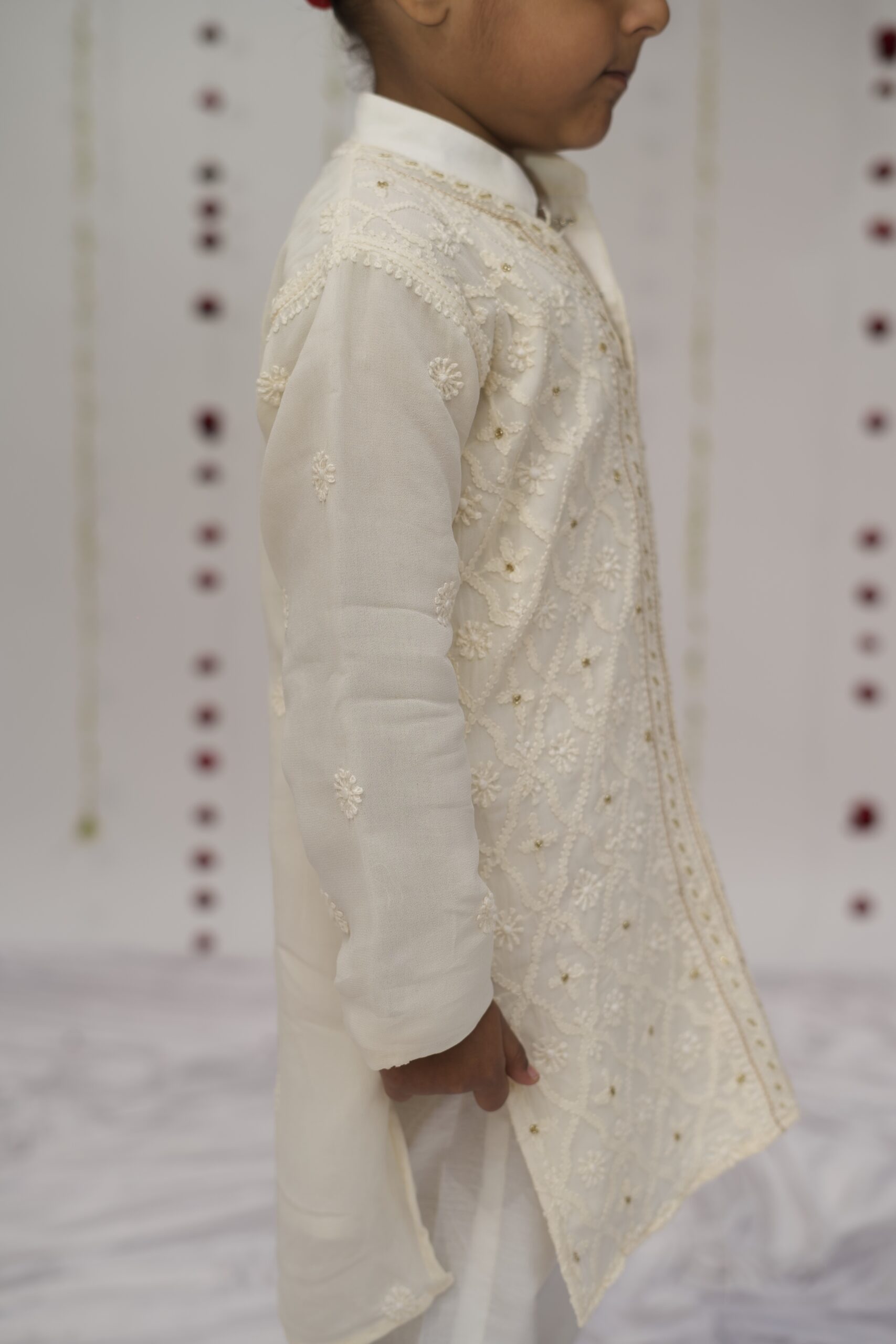 A regal front open sherwani style soft kurta in royal ivory. Hand embroidered with fine chikankari and finished with delicate gold aari and cutdana work. Our kurtas come with pockets, matching pyajamas and soft, pure fabrics for ultimate comfort.