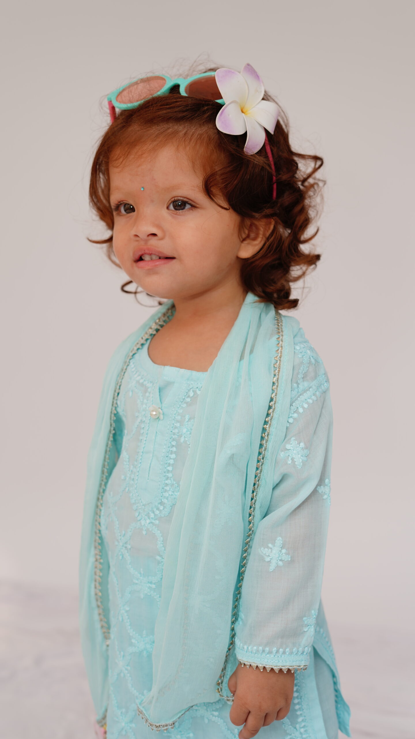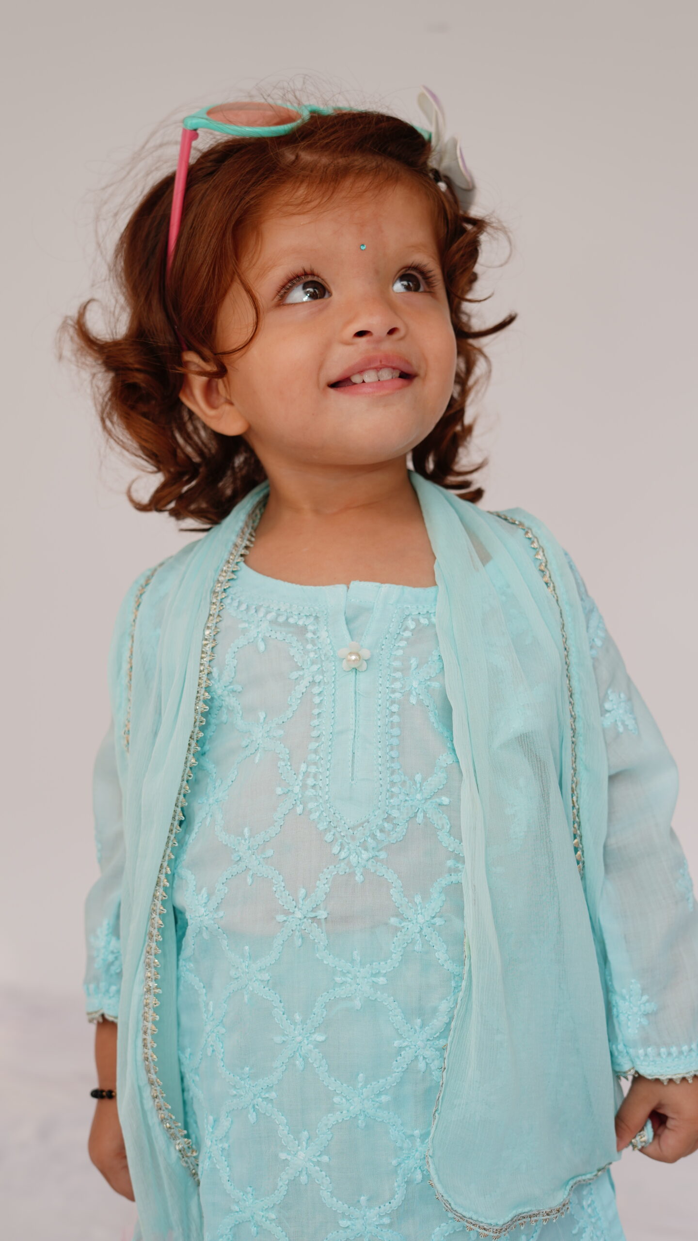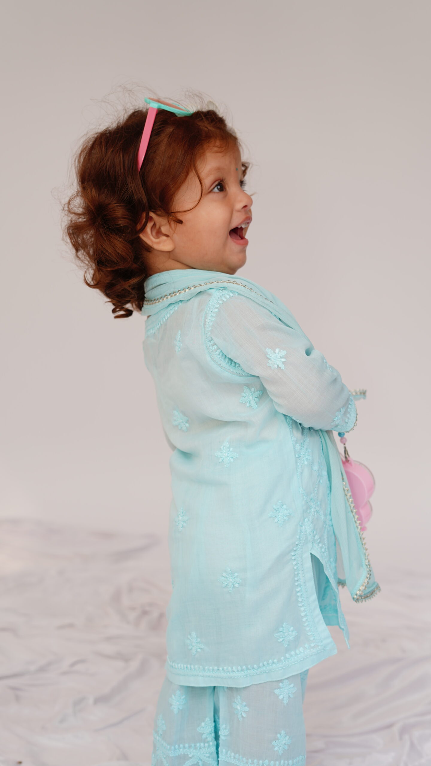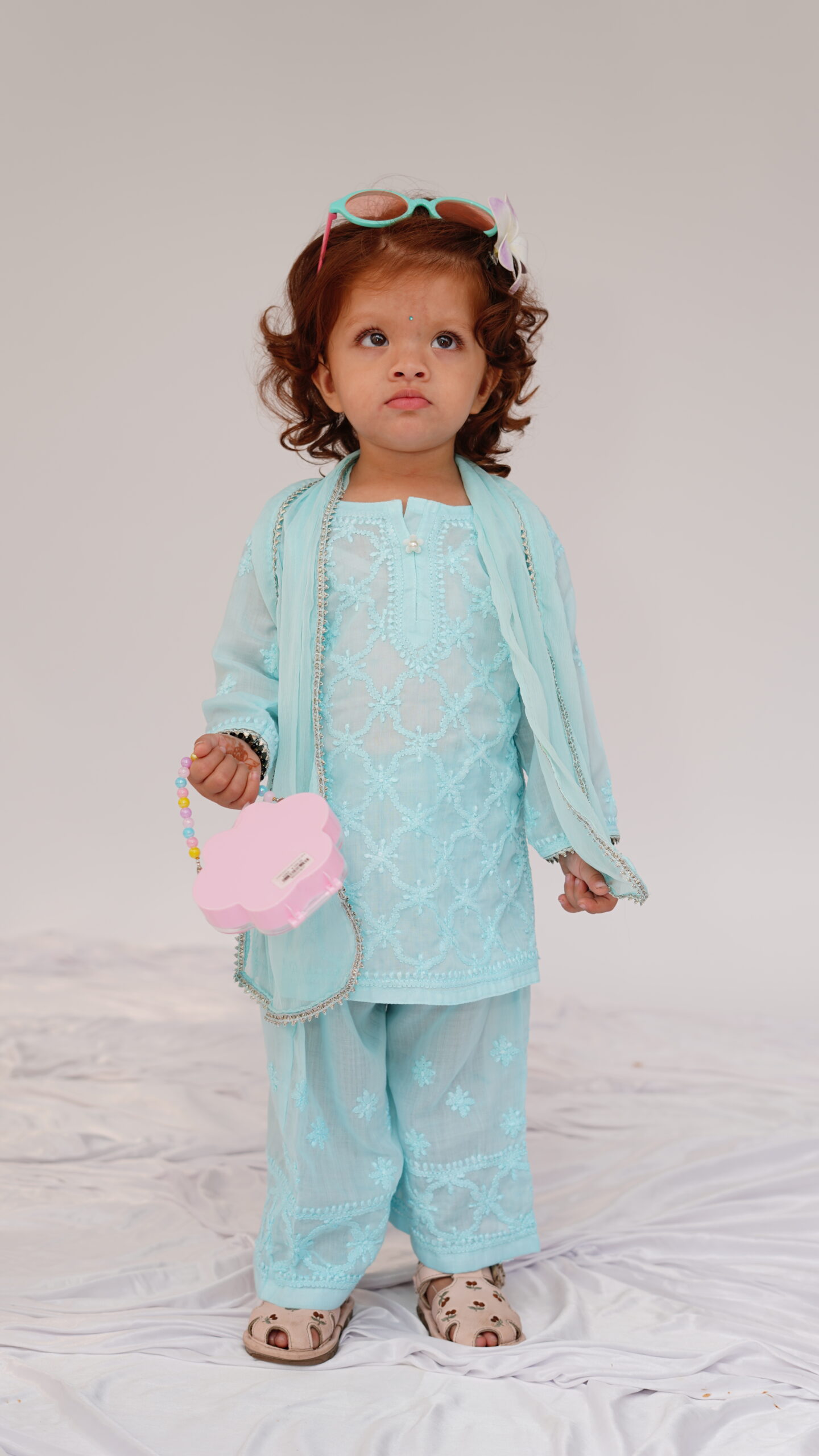 A serene sky blue 3 pc kurta pallazo set that redefines festive dressing for little ones. The kurta and pallazo are intricately hand embroidered in chikankari, complemented with a subtle gota adding a soft glimmer. This ensemble blends heritage craft with modern sophistication – perfect for celebrations under the open sky.
